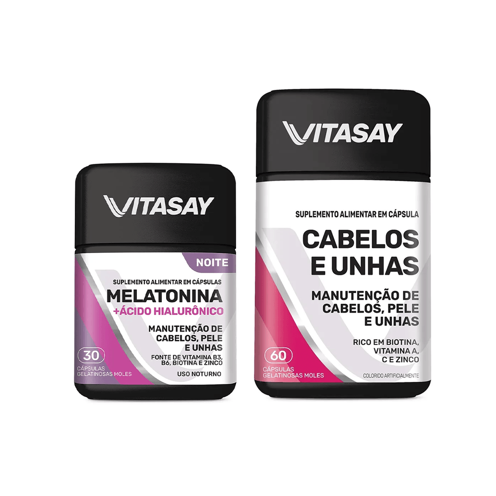 Já à noite, o Vitasay Melatonina + Ácido Hialurônico atua enquanto você descansa, promovendo noites mais tranquilas e apoiando a hidratação e elasticidade da pele.