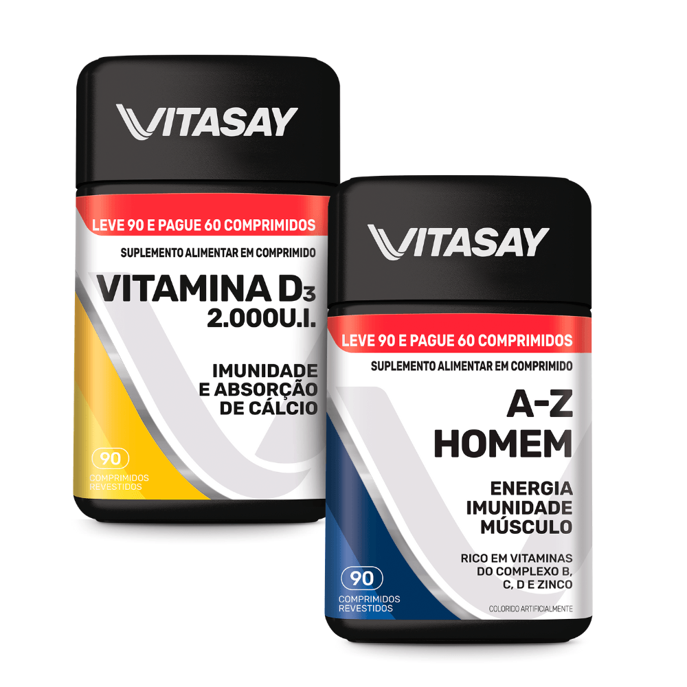 Ele reúne o Multivitamínico A-Z Homem e a Vitamina D3 Vitasay, com fórmulas pensadas especialmente para o organismo masculino.